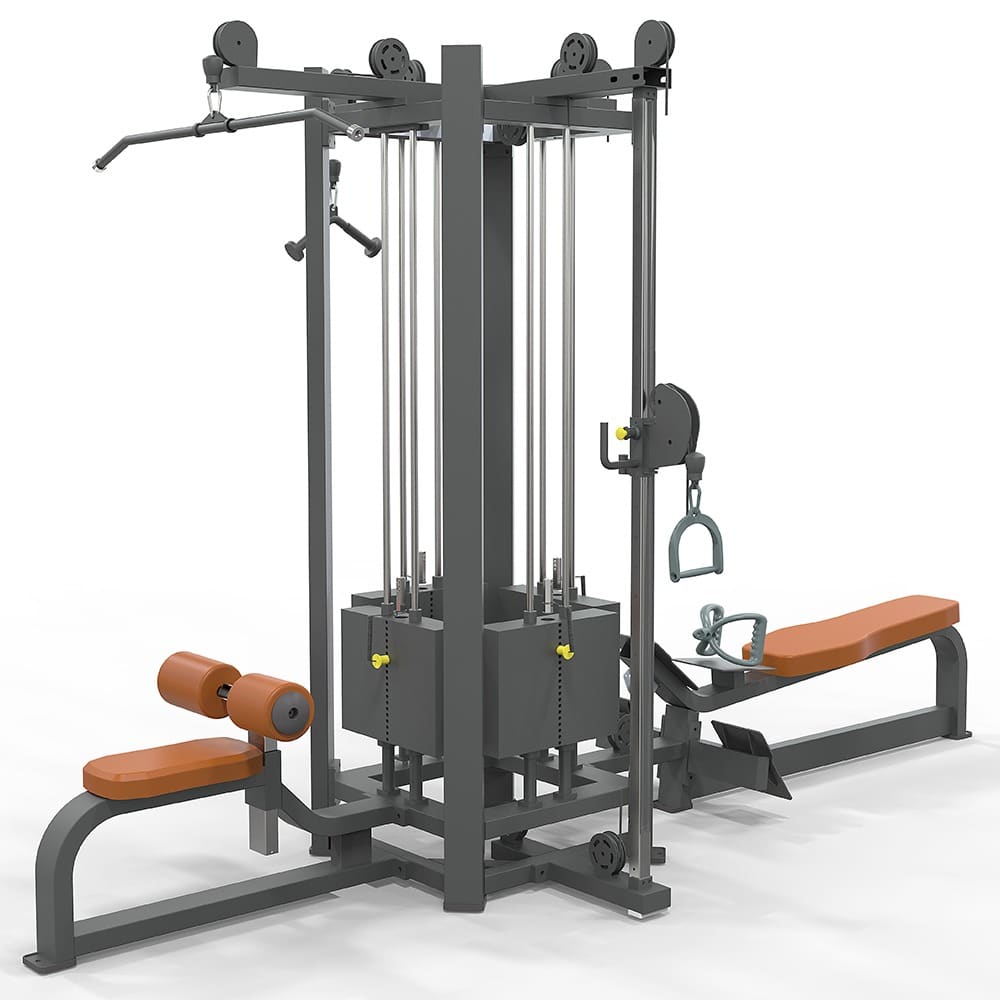 La Multiestación 8 en 1 es una máquina para gimnasio profesional diseñada para entrenamientos completos y simultáneos. Su robusta estructura permite que varios usuarios trabajen diferentes grupos musculares al mismo tiempo, incluyendo ejercicios de fuerza, hipertrofia y tonificación.